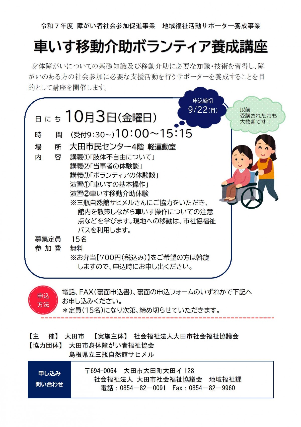 身体障がいについての基礎知識及び移動介助に必要な知識・技術を習得し、障がいのある方の社会参加に必要な支援活動を行うサポーターを養成することを目的とした講座を開催します