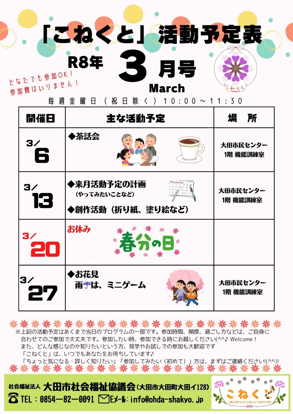 参加される方にとっての居場所づくりや社会関係づくりなどをめざした、”どなたでも”参加できる場『こねくと』をしています。